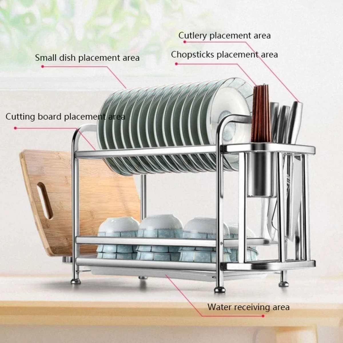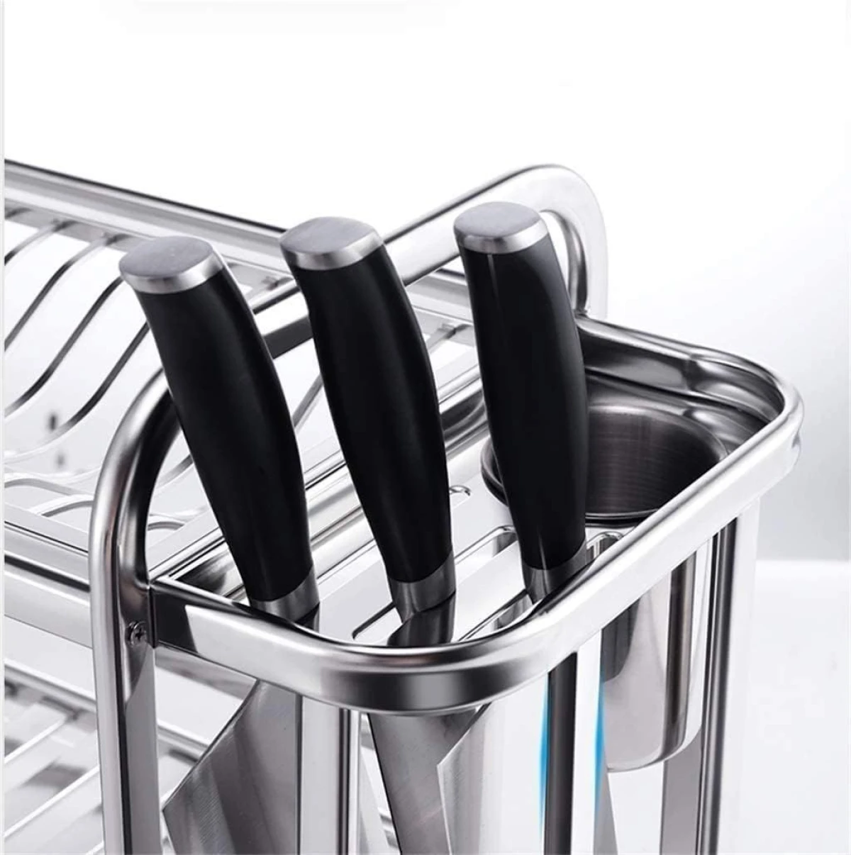 Este escurridor es perfecto para mi cocina. Los utensilios y tablas se mantienen organizados y secos.