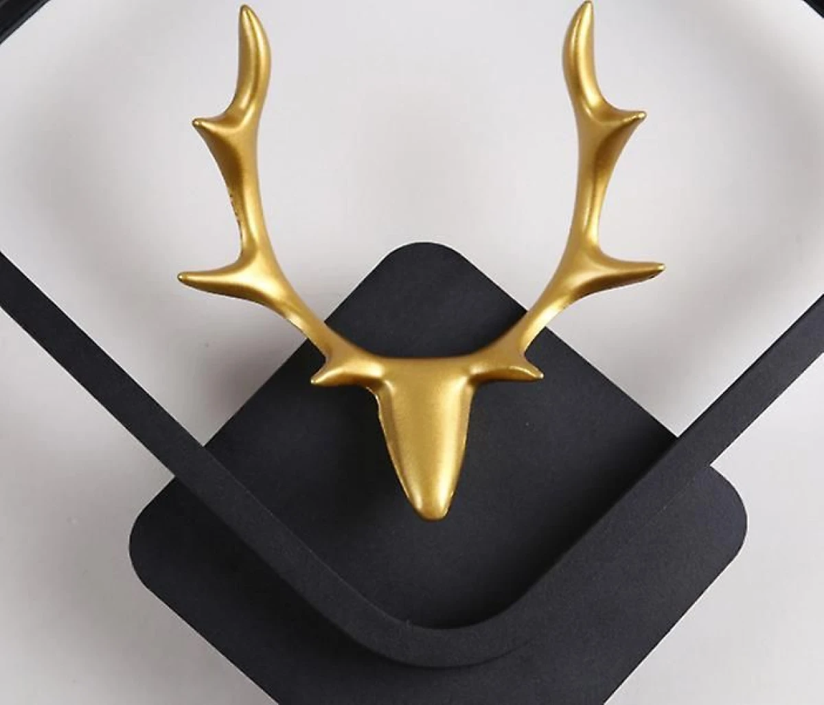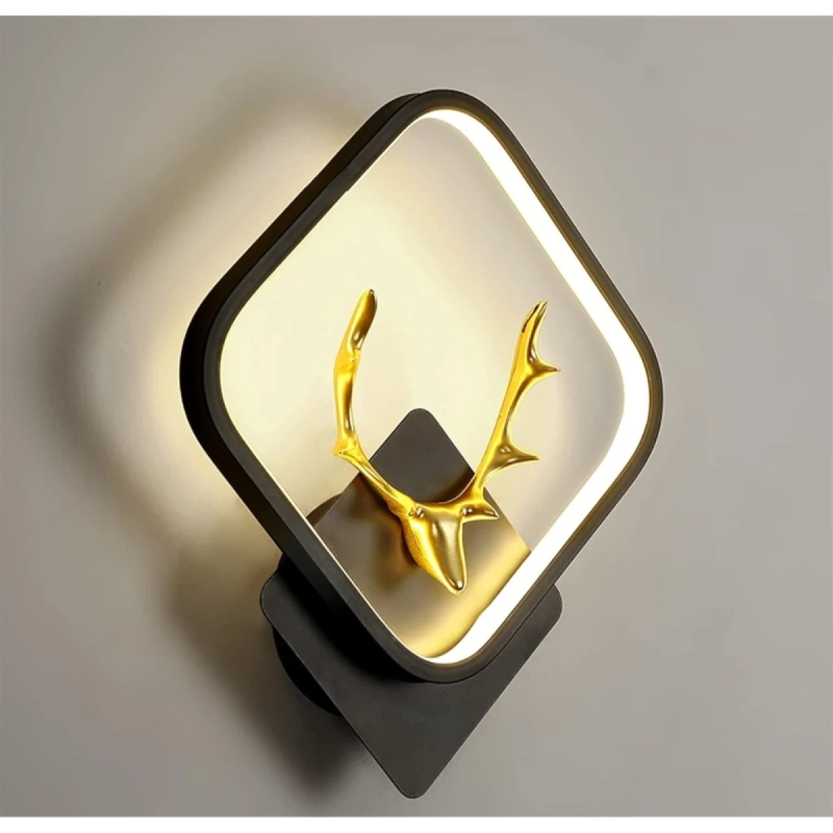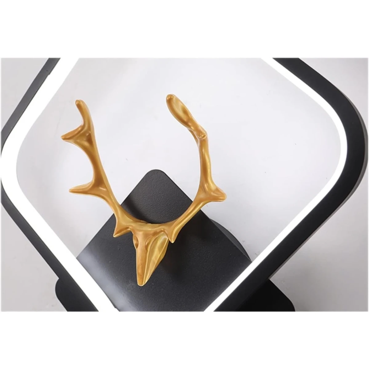 Elegante lampara de pared para decoración con cabeza de Alce dentro de un rombo hecho con acero negro mate y bordes internos con manguera blanca LED que dan salida a una hermosa luz tenue amarilla, mostrando la sombra de los majestuosos cuernos del Alce.