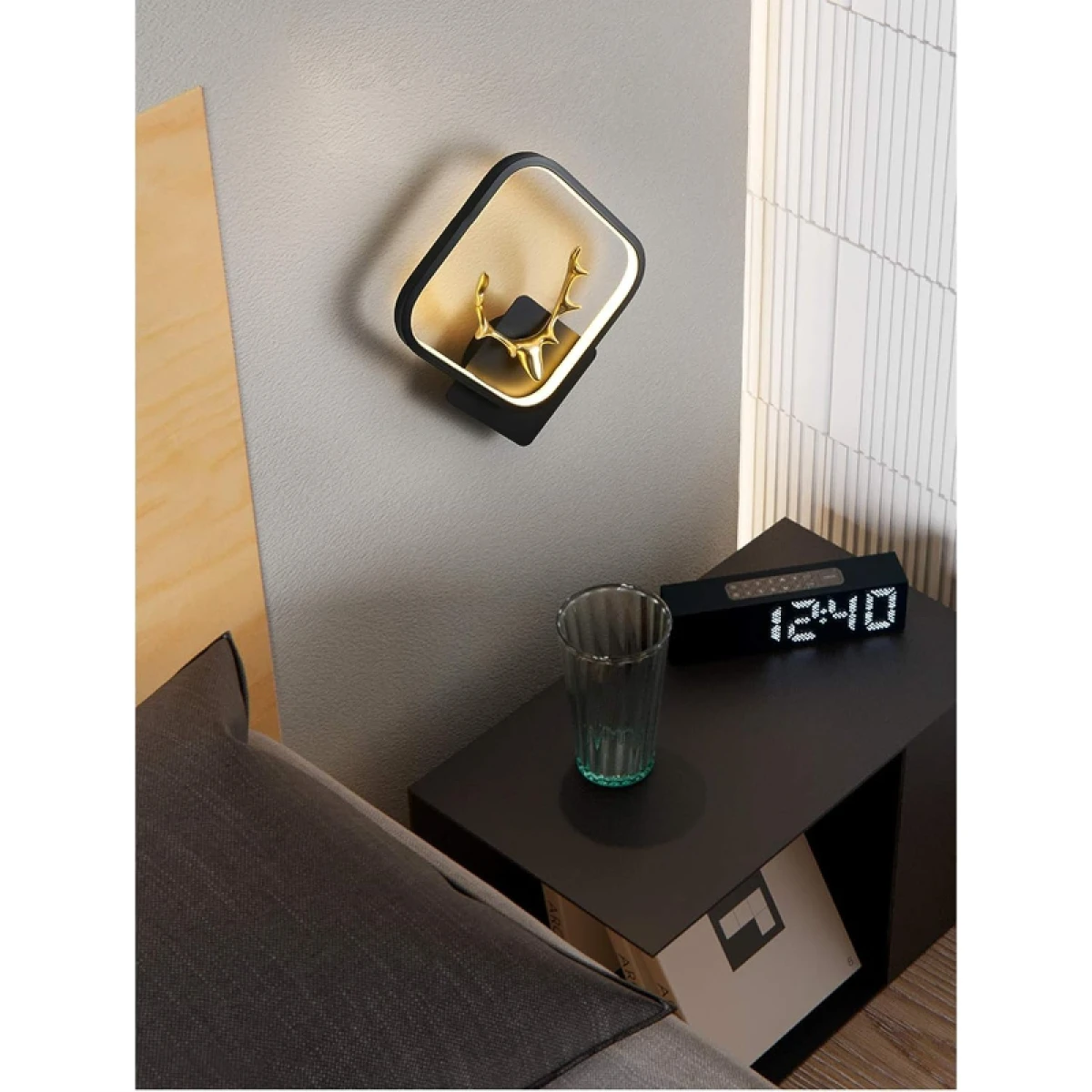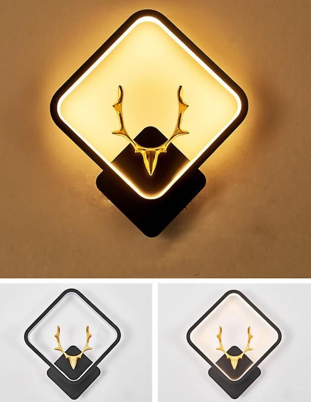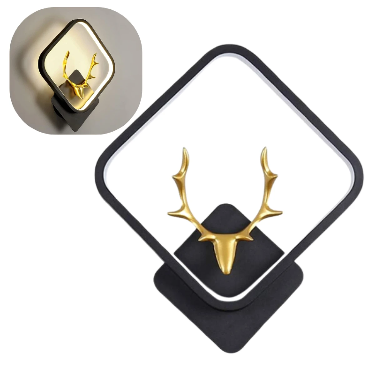 Elegante lampara de pared para decoración con cabeza de Alce dentro de un rombo hecho con acero negro mate y bordes internos con manguera blanca LED que dan salida a una hermosa luz tenue amarilla, mostrando la sombra de los majestuosos cuernos del Alce.