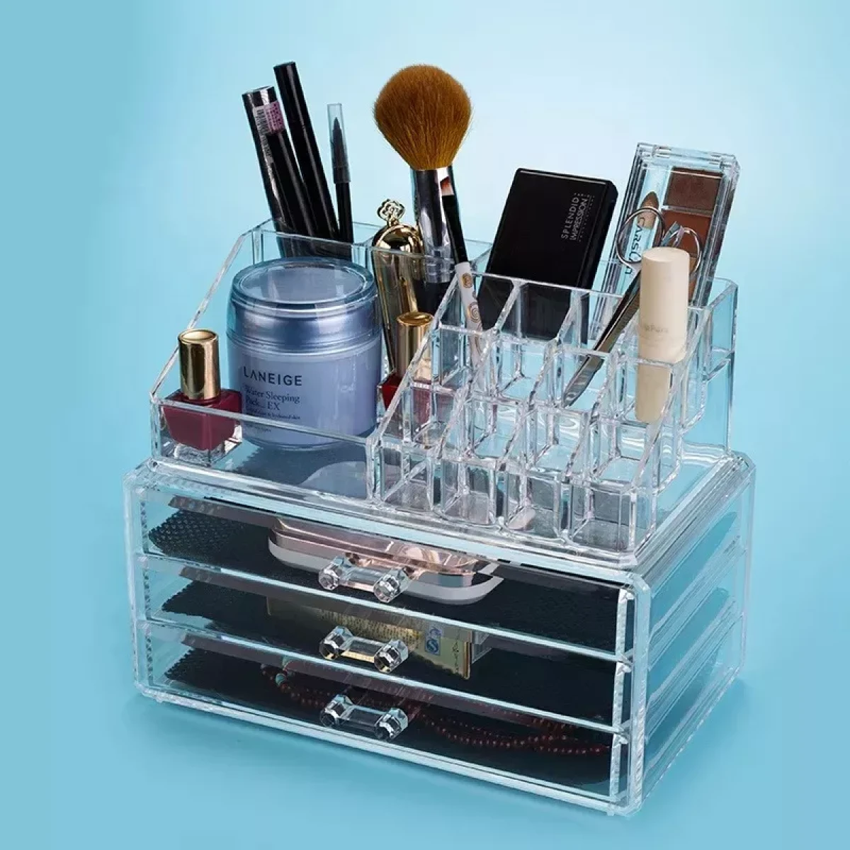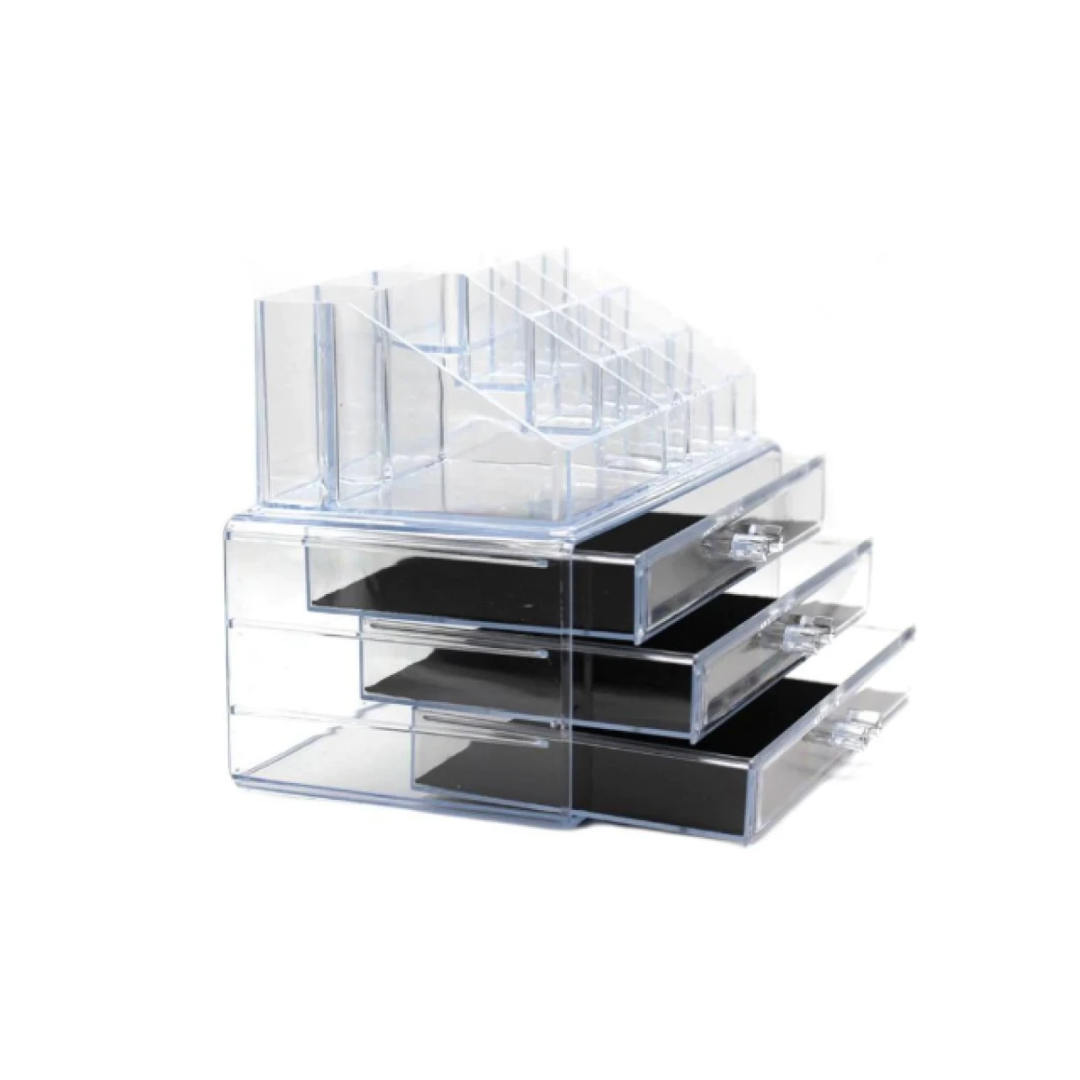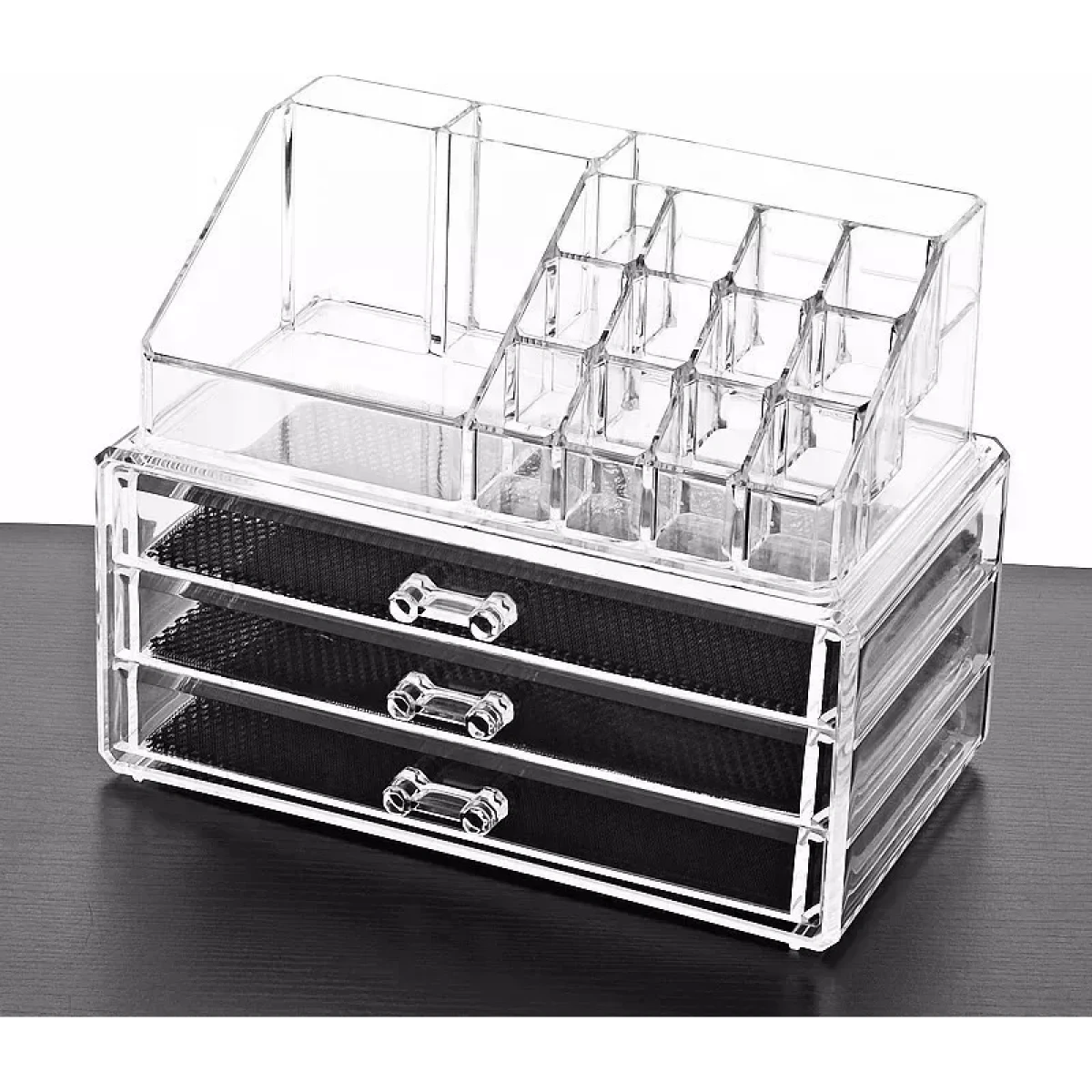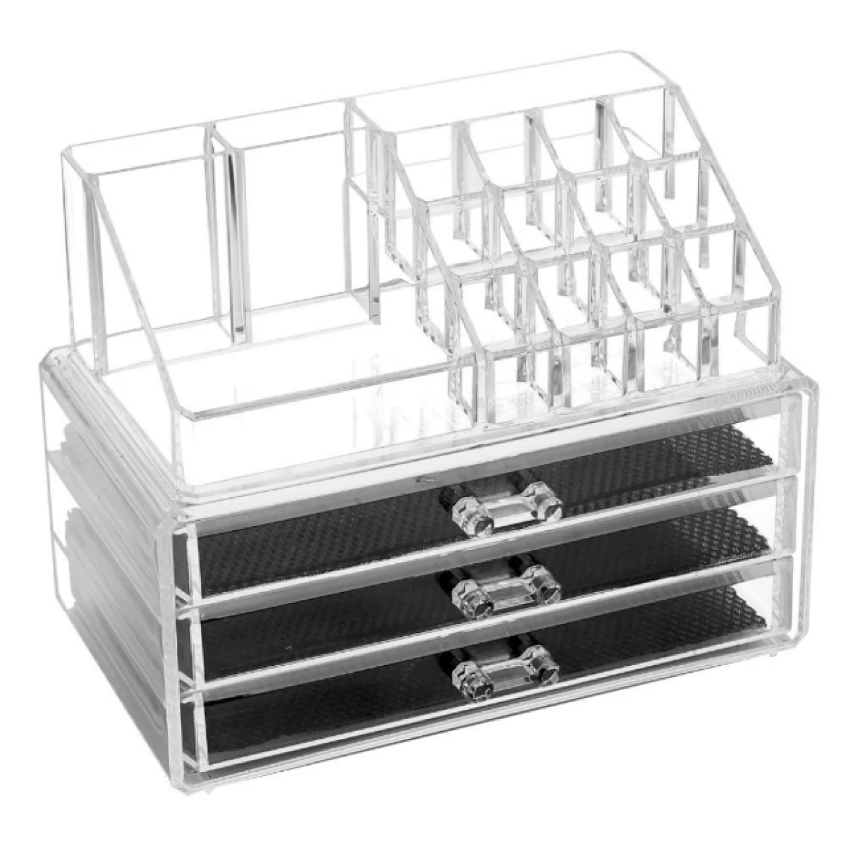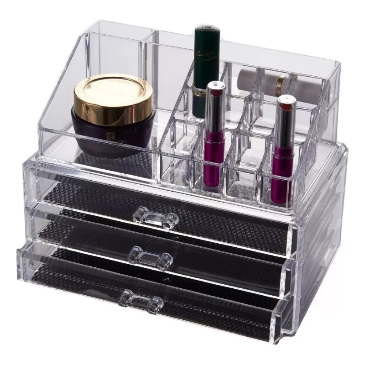 Viene en dos piezas desmontables. La parte superior tiene 16 compartimentos ideales para labiales, brochas, esmaltes y perfumes. La parte inferior cuenta con tres cajones con interior de tela antideslizante para evitar que los productos se deslicen.
